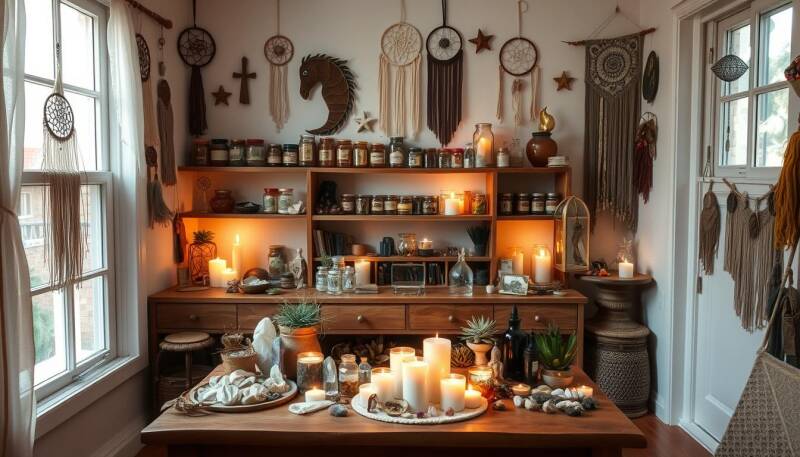 To create a sacred space, start by designating a quiet area for crafting. Cleanse the space with sage or sweetgrass, and protect it with crystals or protective charms. Incorporate personal energy by adding meaningful objects or symbols that resonate with your intentions.