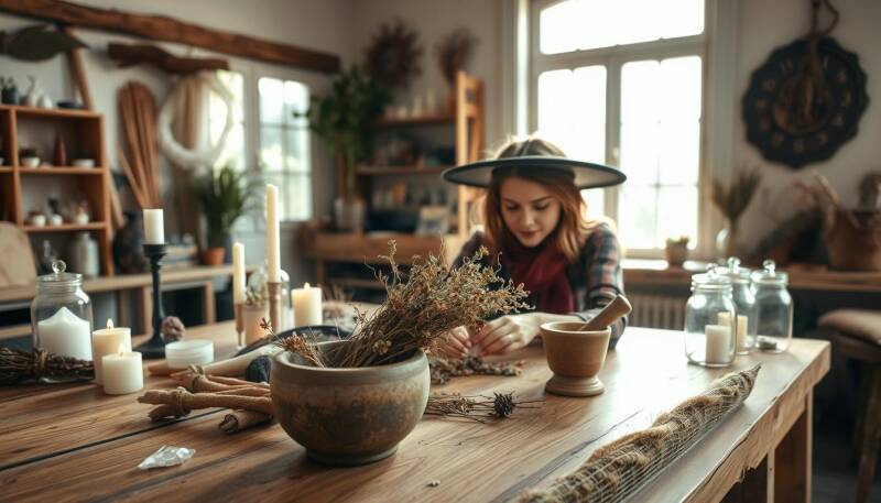 I recommend starting with projects like handmade herb sachets, personal altar items, intention candles, crystal grids, or a spiritual journal. These projects are easy to follow and can enhance your spiritual practice.